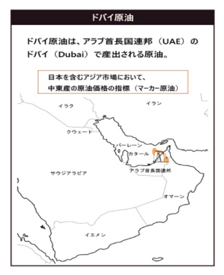 その価格は湾岸地域からの輸出価格およびアジア地域への輸入価格の基準となるドバイ原油は、重質高硫黄の性状で、他の中東産原油とは異なり、ほぼ全量が定期契約に基づかないスポット市場で取引されるため、オマーン原油と共に、アジア市場のおいて中東産の原油価格の指標(マーカー原油)とされています。