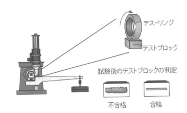 鋼製のブロックと回転するリングとの接触部に潤滑剤を入れ、加重を加えてリングを回転させ、一定時間後にブロックの摩擦面状態を調べます。